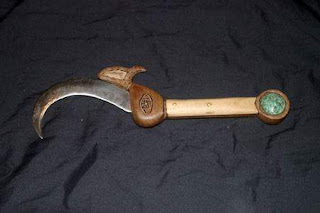 Curiosidade: De acordo com vertentes Neo-pagãs, crê-se que esse instrumento é confeccionado em cabo branco para não ser confundido com o Athame, que é geralmente confeccionado em cabo preto.
